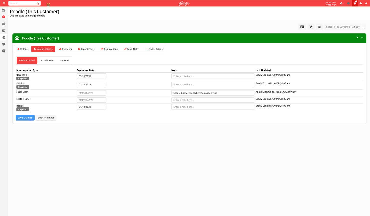 - Pet and pet parent fields (e.g., updating emergency contacts or vet info).